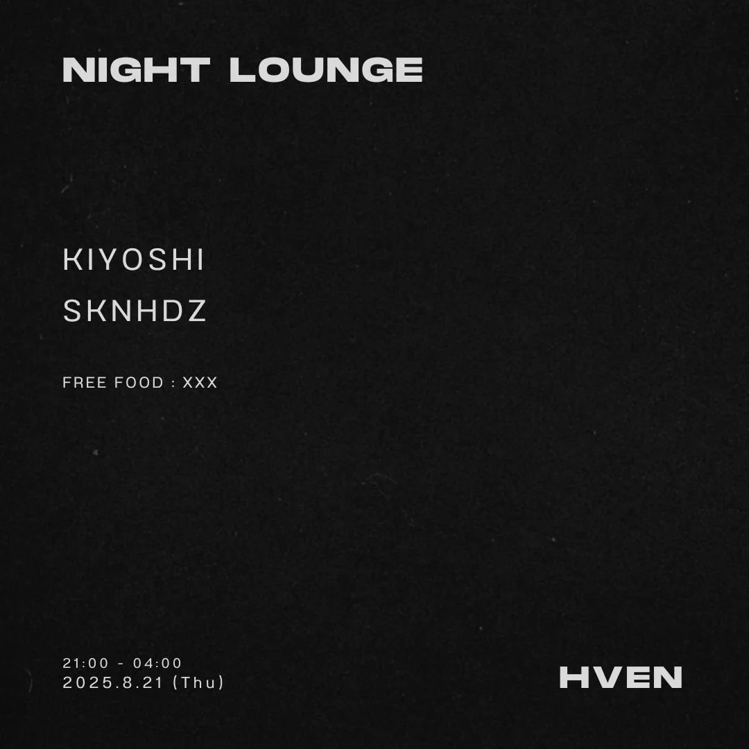 NIGHT LOUNGE Thursday, August 21, 2025 9:00 PM Friday, August 22, 2025 4:00 AM Google Calendar ICS AUGUST 21time: 21:00 - 05:00entrance: ¥1500genre: Mixed GenresLine up:KIYOSHI SKNHDZ Free food : XXX