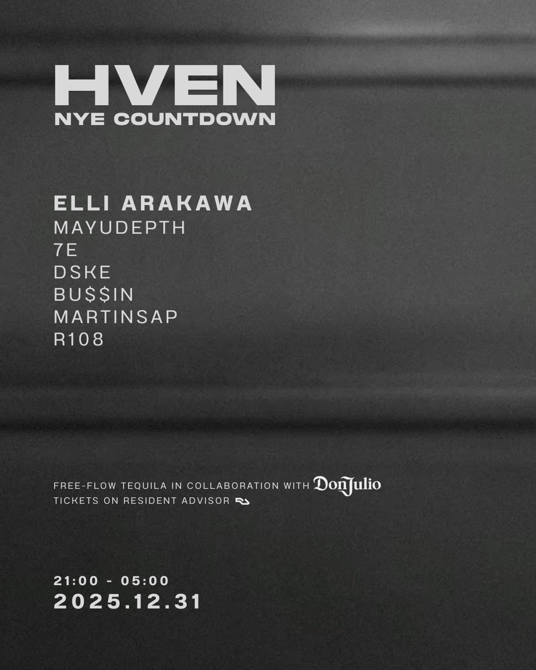 Featuring a curated lineup of techno and house DJs leading into 2026: headliner Elli Arakawa, MAYUDEPTH, 7e, DSKE, BU$$IN, R108, and Martinsap, bringing together both local and international talent.