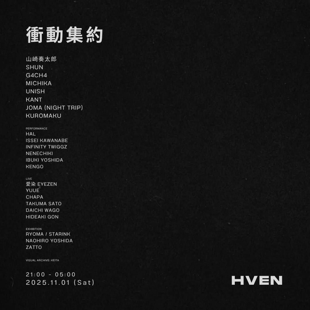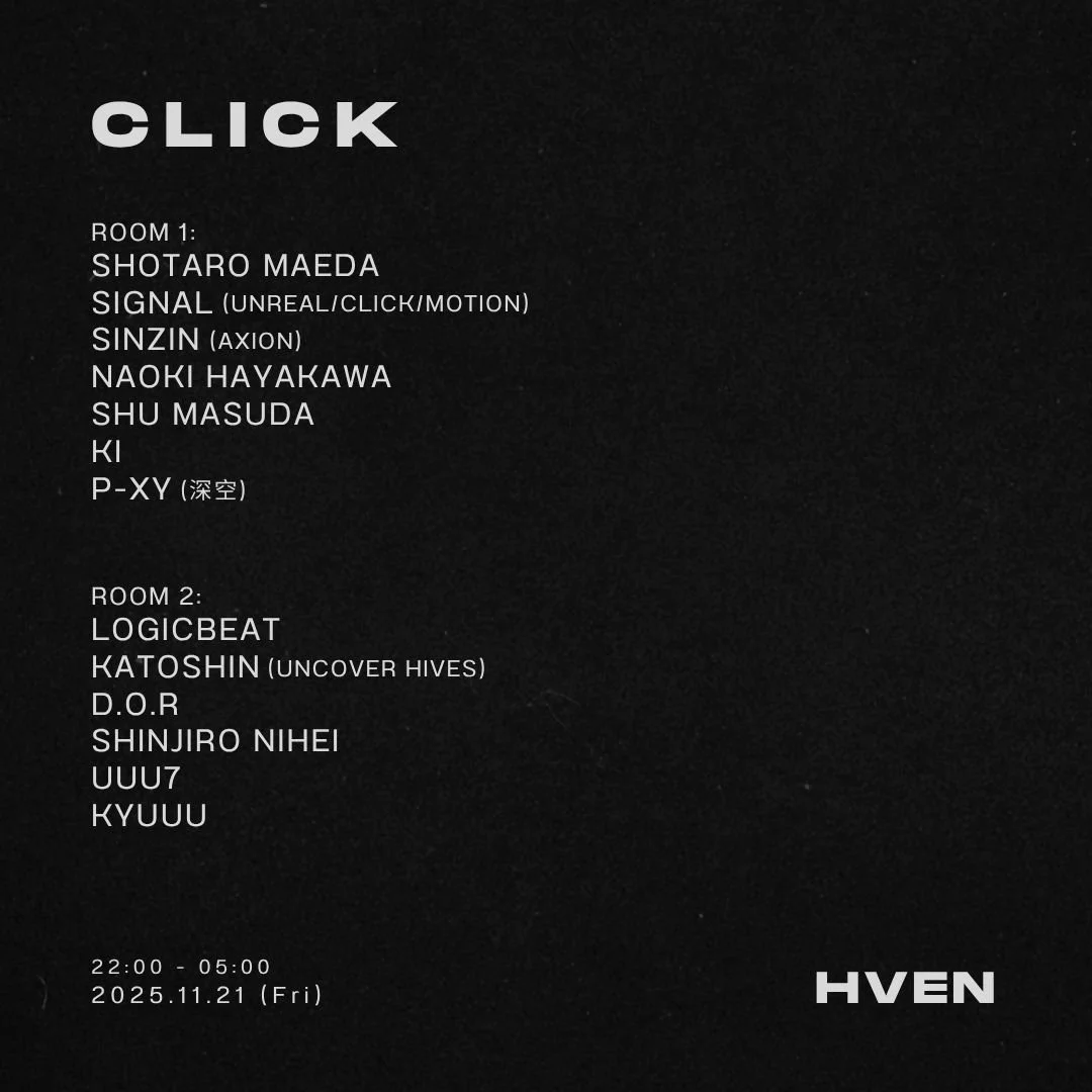 < PREVIOUS MONTH SCHEDULE: NOVEMBER EXPLORE OUR RESIDENT ADVISOR PROFILE FOR SELECT EVENTS & TICKETS Nov 21 to Nov 22 CLICK Fri, Nov 21, 2025 10:00 PM Sat, Nov 22, 2025 5:00 AM Google Calendar ICS View Event → Nov 22 to Nov 23 POPOFF KITCHEN 大宴 TOKYO Sat, Nov 22, 2025 11:00 PM Sun, Nov 23, 2025 6:00 AM Google Calendar ICS View Event → Nov 23 to Nov 24 OTO Sun, Nov 23, 2025 10:00 PM Mon, Nov 24, 2025 5:00 AM Google Calendar ICS View Event → Nov 24 &A_Refined Monday, November 24, 2025 4:00 PM 11:00 PM Google Calendar ICS View Event → Nov 28 to Nov 29 PLEASURE DELUXE Fri, Nov 28, 2025 10:00 PM Sat, Nov 29, 2025 5:00 AM Google Calendar ICS View Event → Nov 19 to Nov 20 ODYSSEY supported by Carabao Wed, Nov 19, 2025 8:00 PM Thu, Nov 20, 2025 3:00 AM Google Calendar ICS View Event → Nov 8 to Nov 9 TECHVANE Sat, Nov 8, 2025 9:00 PM Sun, Nov 9, 2025 5:00 AM Google Calendar ICS View Event → Nov 7 to Nov 8 QUEEREST: TRANSIT WITHOUT BORDERS - 東亜怪物房 Fri, Nov 7, 2025 11:00 PM Sat, Nov 8, 2025 6:00 AM Google Calendar ICS View Event → Nov 5 to Nov 6 WEDNESDAY LOUNGE Wed, Nov 5, 2025 9:00 PM Thu, Nov 6, 2025 4:00 AM Google Calendar ICS View Event → Nov 4 to Nov 5 YOASOBI GROOVE CLUB Tue, Nov 4, 2025 9:00 PM Wed, Nov 5, 2025 4:00 AM Google Calendar ICS View Event → Nov 3 to Nov 4 GRAVITY Mon, Nov 3, 2025 10:00 PM Tue, Nov 4, 2025 4:00 AM Google Calendar ICS View Event → Nov 1 to Nov 2 衝動集約 Sat, Nov 1, 2025 9:00 PM Sun, Nov 2, 2025 6:00 AM Google Calendar ICS View Event →