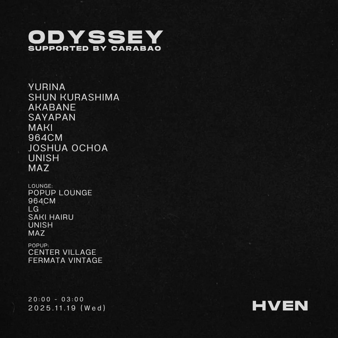 Nov 19 to Nov 20 ODYSSEY supported by Carabao Wed, Nov 19, 2025 8:00 PM Thu, Nov 20, 2025 3:00 AM Google Calendar ICS View Event →