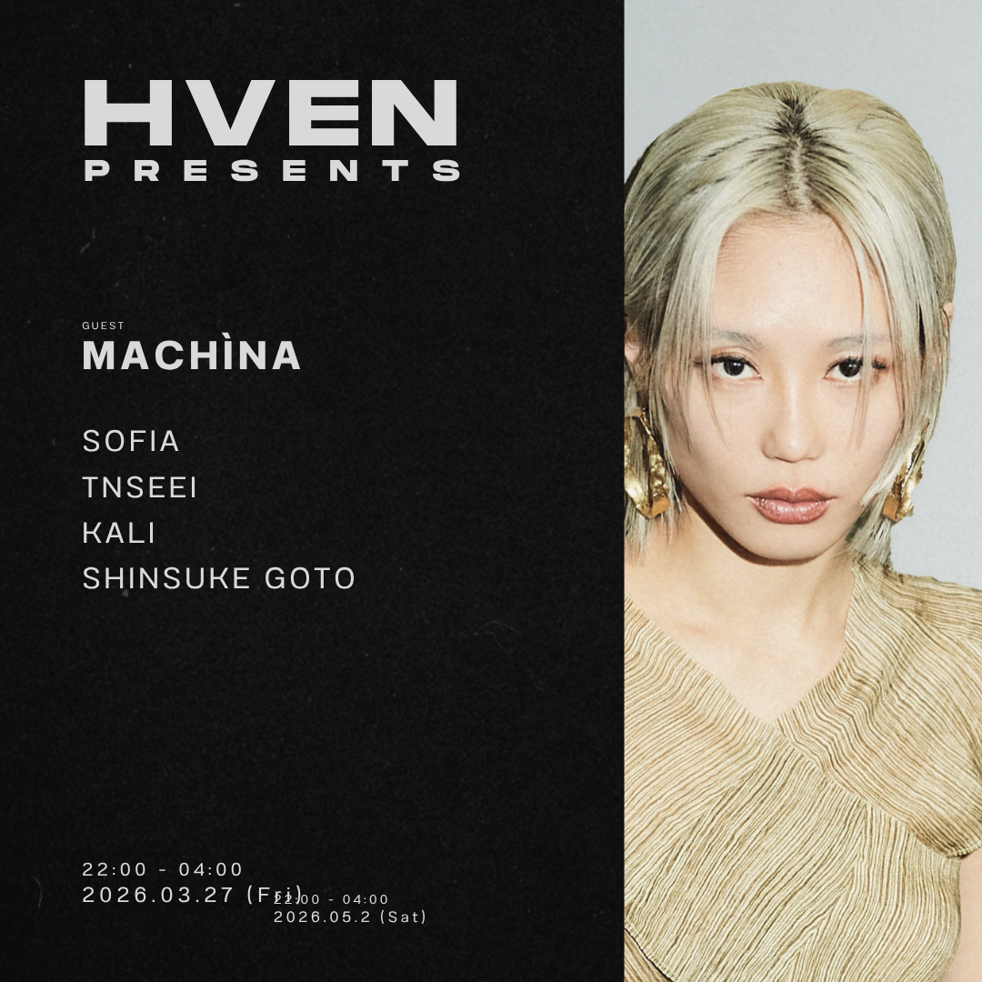Machìna is a Tokyo-based electronic artist whose work combines synthesizer-driven production with expressive vocals, drawing on a background in jazz and live performance. Known for immersive sets and cross-disciplinary output spanning music, visuals and performance, she brings her evolving sound to HVEN.