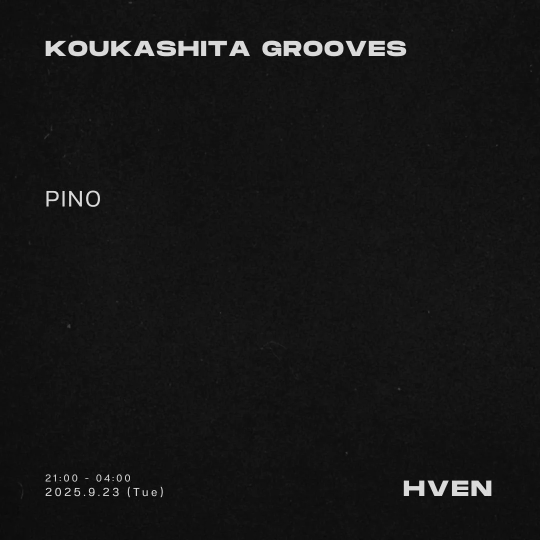 KOUKASHITA GROOVES Wednesday, September 24, 2025 4:00 AM 10:00 PM Google Calendar ICS SEP 23time: 21:00 - 04:00entrance: ¥1500 genre: Dance MusicLine up:PInO BD SP